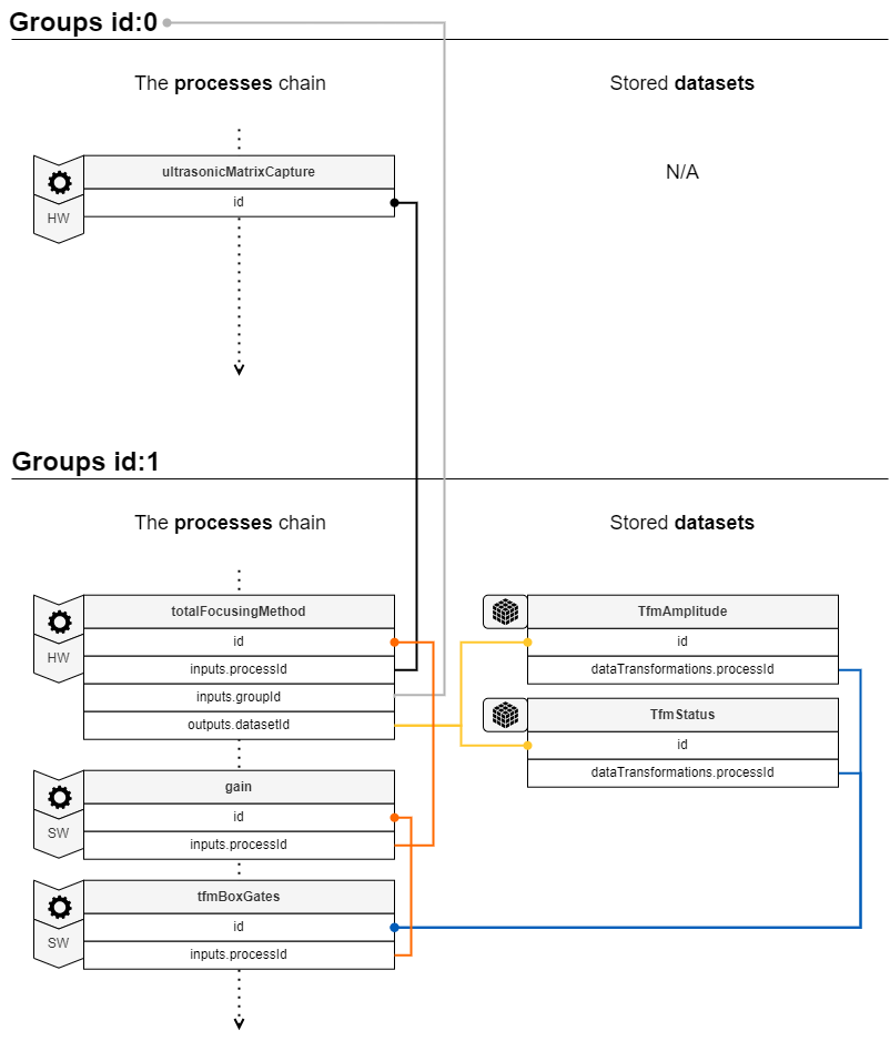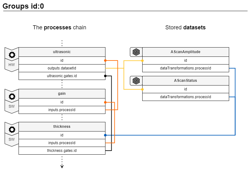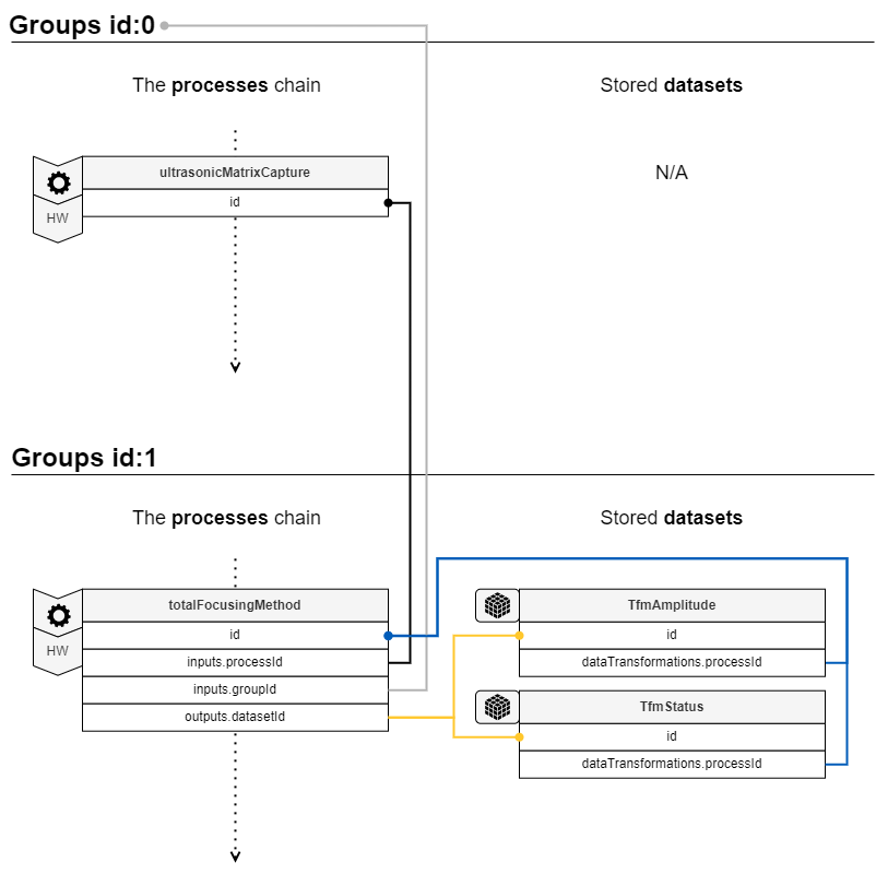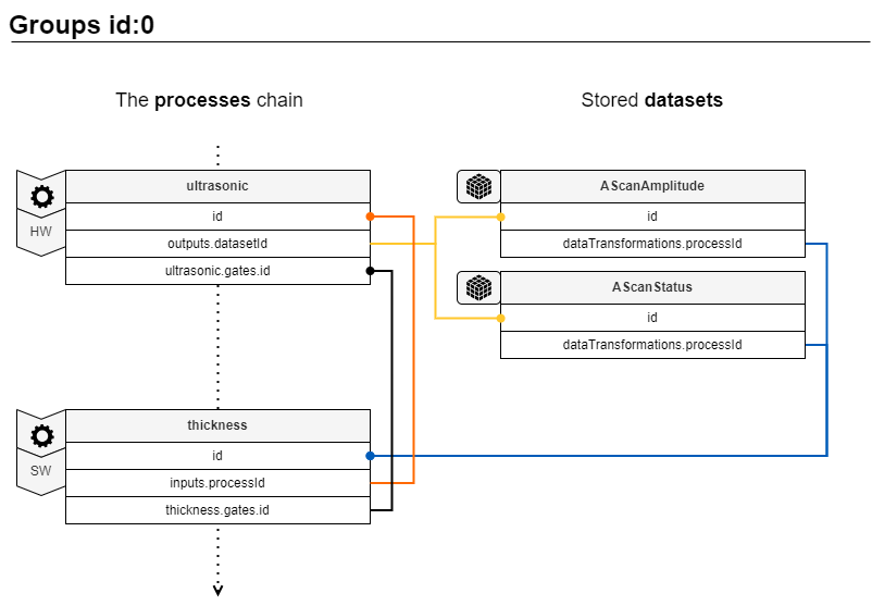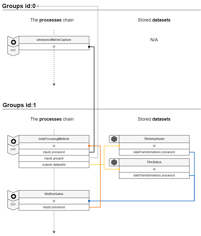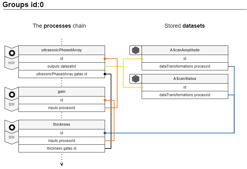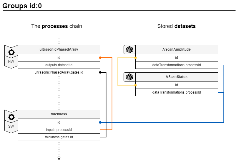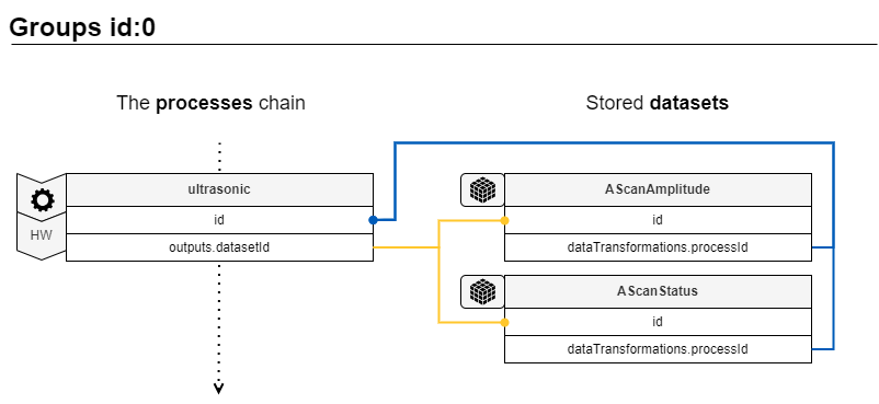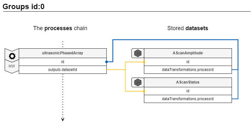 The following examples illustrate the typical structure and relationships of groups used in ultrasonic inspections. Note that, in these examples, processes are shown in a chain; however, they could also be branched for more complex cases. Only cross-referenced IDs are represented to help clarify the various intra- and inter-group relationships between processes and datasets.